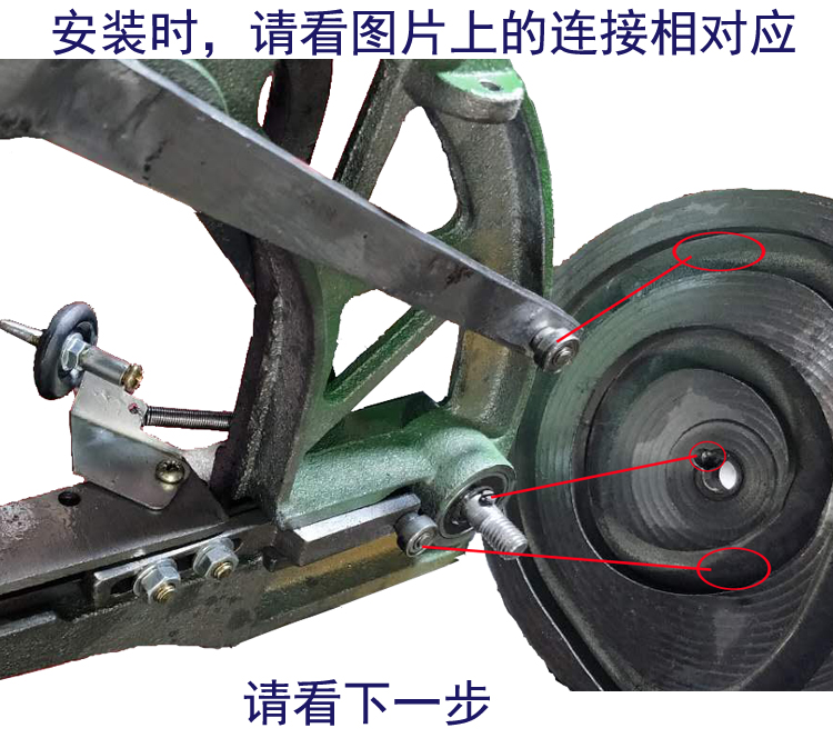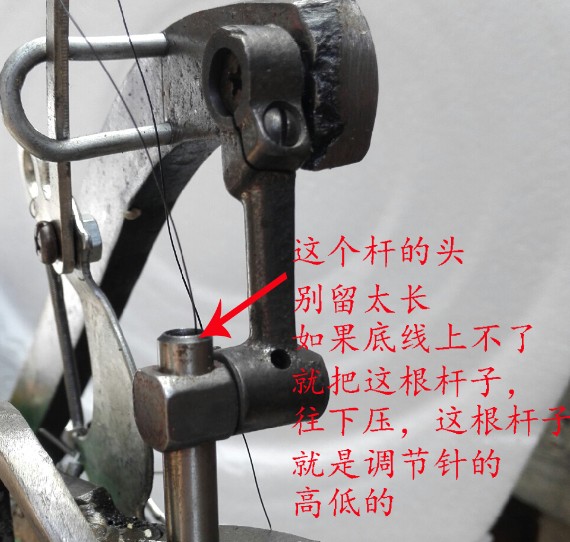 九.针杆上下的调整:在游针阶段,针眼孔应对准梭托底板平面,不然就应进行调整,方法是松开小连杆轴上的螺丝,移动针杆到正确的位置再拧紧。