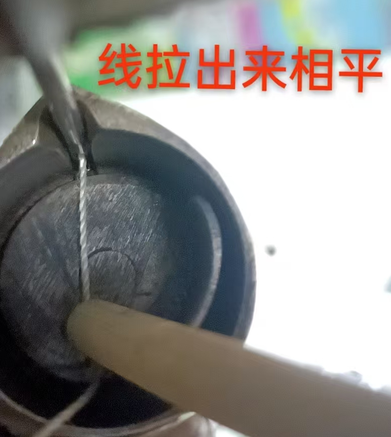 当位置调好后,用左手轻轻拉住面线线头按在梭床前,右手顺时针转动转盘,左手提起线头,便能把底线引出来,底线引不出就是由于位置没调对哦,一定要调好再操作。
